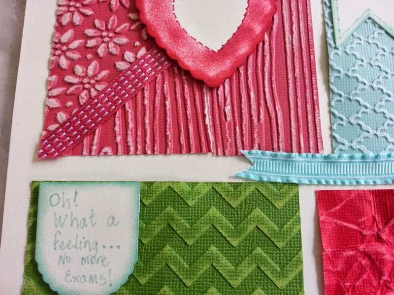 In this photo you can see the details of two *TIEFs - the top left hand is "Petals-a-Plenty" and the bottom corner of the same square is "Woodgrain"; I cut the square in half diagonally and used the TIEFs then sanded the textured side which was raised. This was tricky to do, I had to remember to have the Textured side UP as I placed the piece of card into the Folder which had the RAISED section of the folder UP as well. This ensured the raised pattern pushed up through the card and then I could sand off the top colour with Stampin' Sanding System.